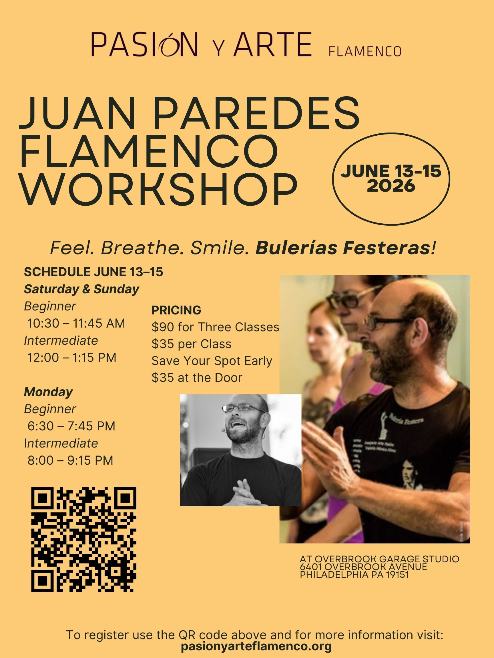 Juan Paredes will be back in Philly with his renowned Soniquete workshop and Bulerías Festeras from June 13–15. More information about signing up will be shared soon.